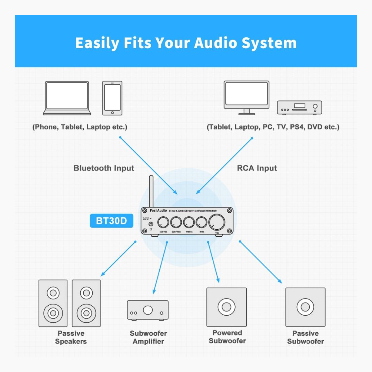 2.1 Channel Bass Treble 2*120W Audio Amp 240W Subwoofer Bluetooth Sound