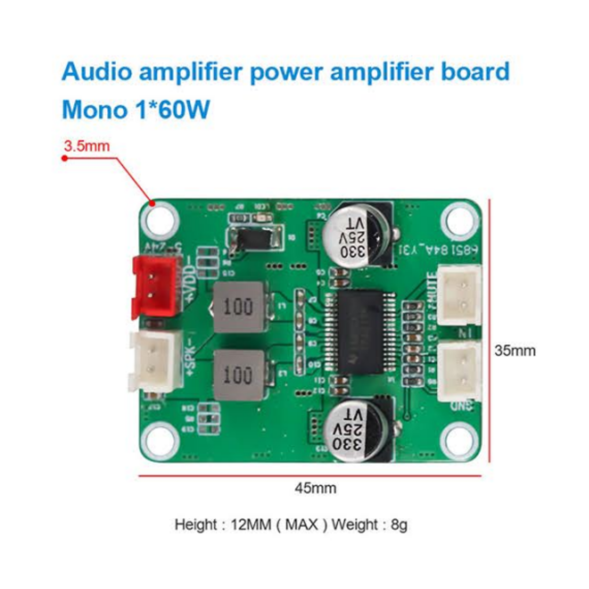 The VIRE-1C060 V1.1 Class D Audio Amplifier is a compact, efficient, and reliable mono amplifier designed to deliver 60W of clean output power. Powered by the TPA3118D2 amplifier chip, it ensures distortion-free sound and stable performance, making it an excellent choice for DIY audio projects, compact speaker systems, and subwoofer applications.