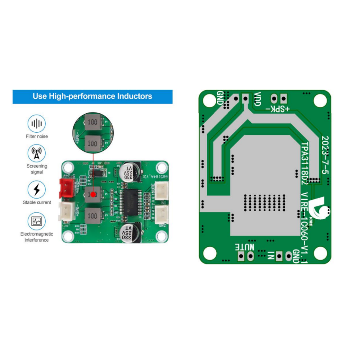 With an input voltage range of 12V–24V DC, this amplifier offers flexible power options while maintaining consistent output. The inclusion of high-performance inductors ensures stable current delivery, effective noise filtering, and reduced electromagnetic interference, resulting in superior audio quality.