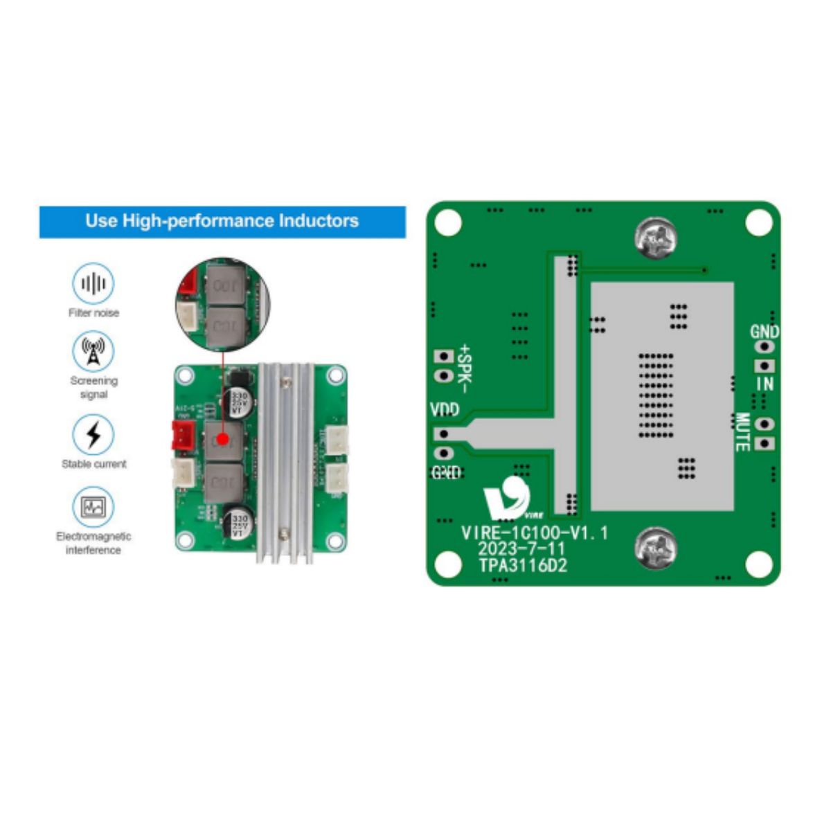 The VIRE-1C100 V1.1 Class D Audio Amplifier is a compact and efficient mono amplifier designed for powerful single-channel audio output. Equipped with a reliable TPA3116D2 amplifier chip, it delivers up to 100W of clean and distortion-free power, making it ideal for driving subwoofers or full-range speakers in custom audio setups.