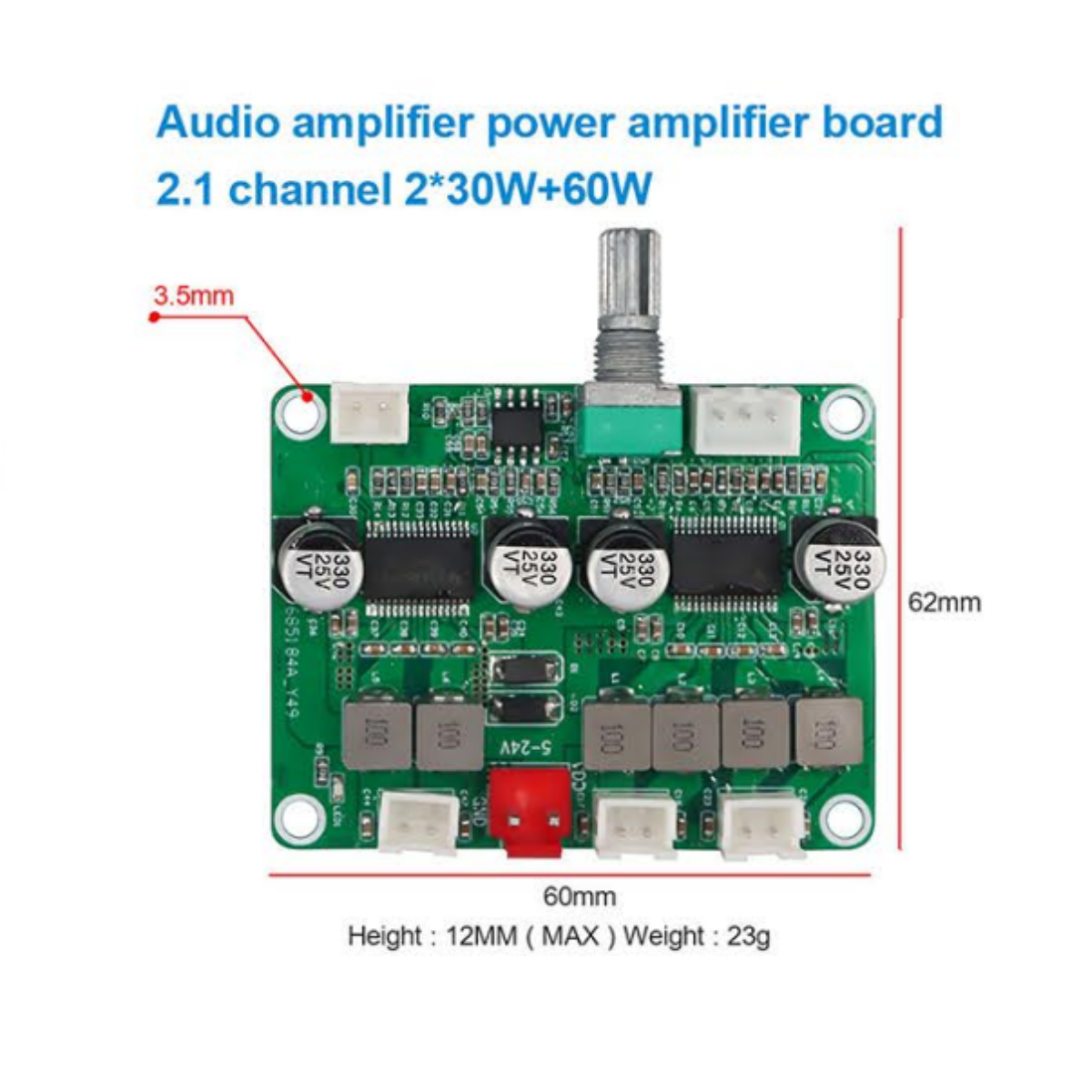 With its wide DC 12V–24V input range, the amplifier is versatile and suitable for DIY projects, home theaters, car audio, and portable speaker systems. The inclusion of a dedicated bass control knob allows users to fine-tune low frequencies for a rich and immersive listening experience.