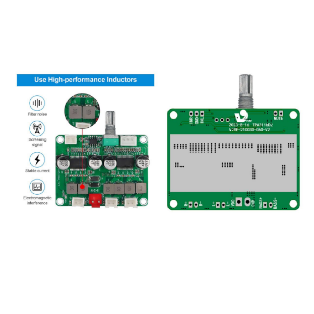 Amplifier Chip: Dual TPA3118D2 high-performance chips
