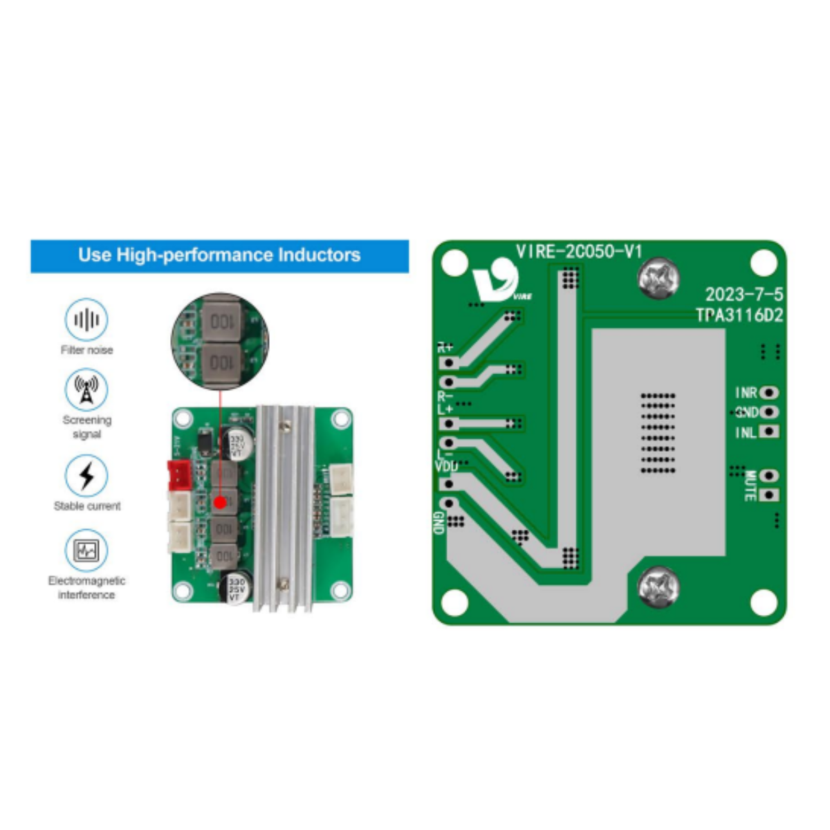 The VIRE-2C050 V1 Class D Audio Amplifier is a compact and efficient stereo amplifier built for clear, distortion-free sound. Using the reliable TPA3116D2 amplifier chip, it delivers up to 2 × 50W output power, making it ideal for medium-power audio projects such as desktop speakers, home audio, or DIY sound systems.