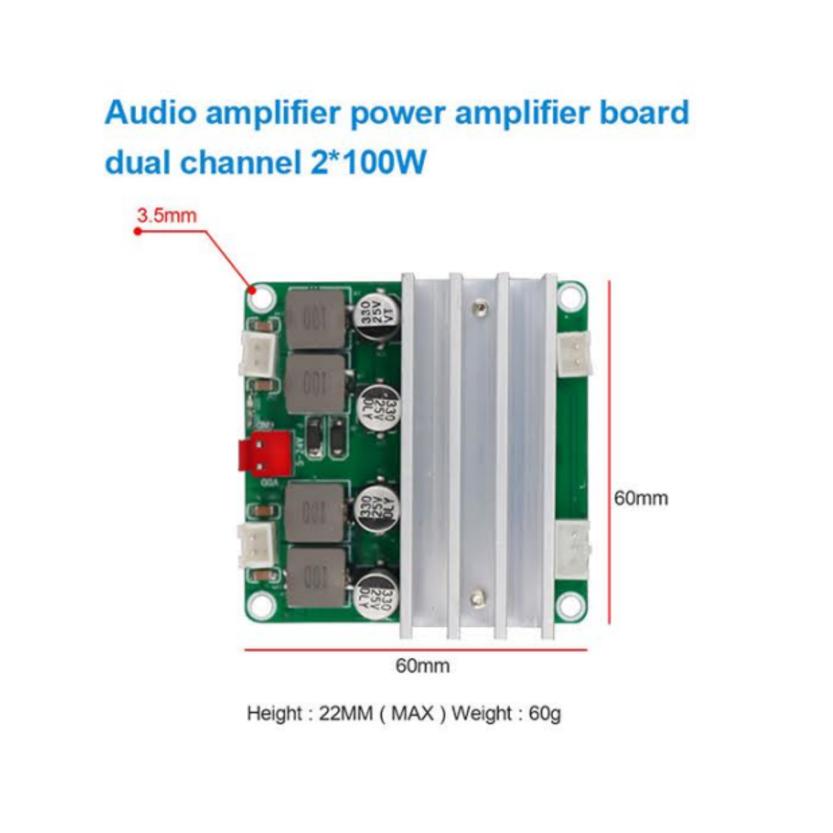 Operating on a DC 12V–24V input, this amplifier is compact yet powerful, measuring just 60mm × 60mm × 22mm and weighing only 60g, making it ideal for integration into DIY audio projects, home sound systems, or portable audio solutions.
