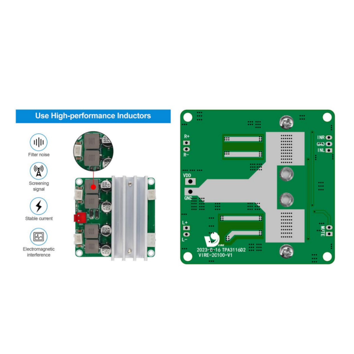 The VIRE-2C100 V1 Class D Audio Amplifier is a high-power stereo amplifier designed to deliver crisp, clear, and distortion-free sound. Built around dual TPA3116D2 amplifier chips, it provides a robust 2 × 100W output, making it suitable for driving powerful stereo speaker setups with ease.