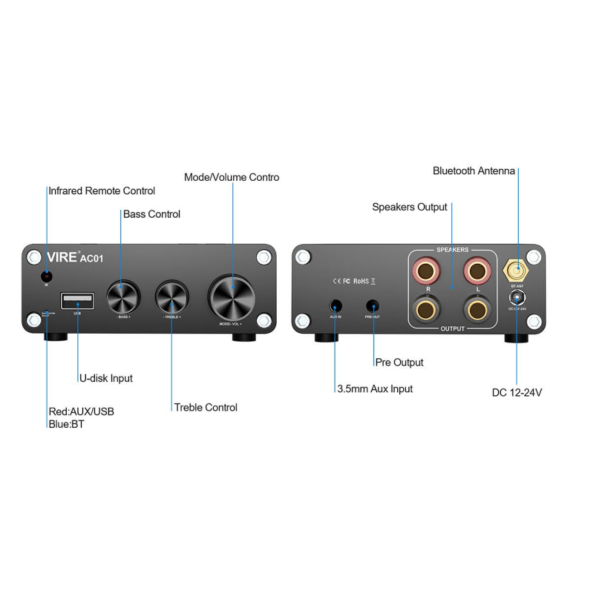 The VTF-AC01 Bluetooth Power Amplifier is a versatile and powerful Class D amplifier designed for seamless wireless and wired audio connectivity. Powered by dual TPA3116 amplifier chips, it delivers a robust 2 × 100W output, providing clear and distortion-free sound suitable for both passive and powered speakers.