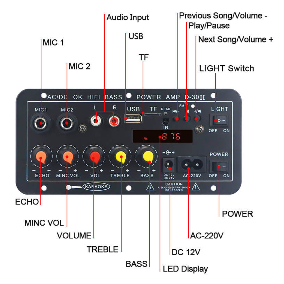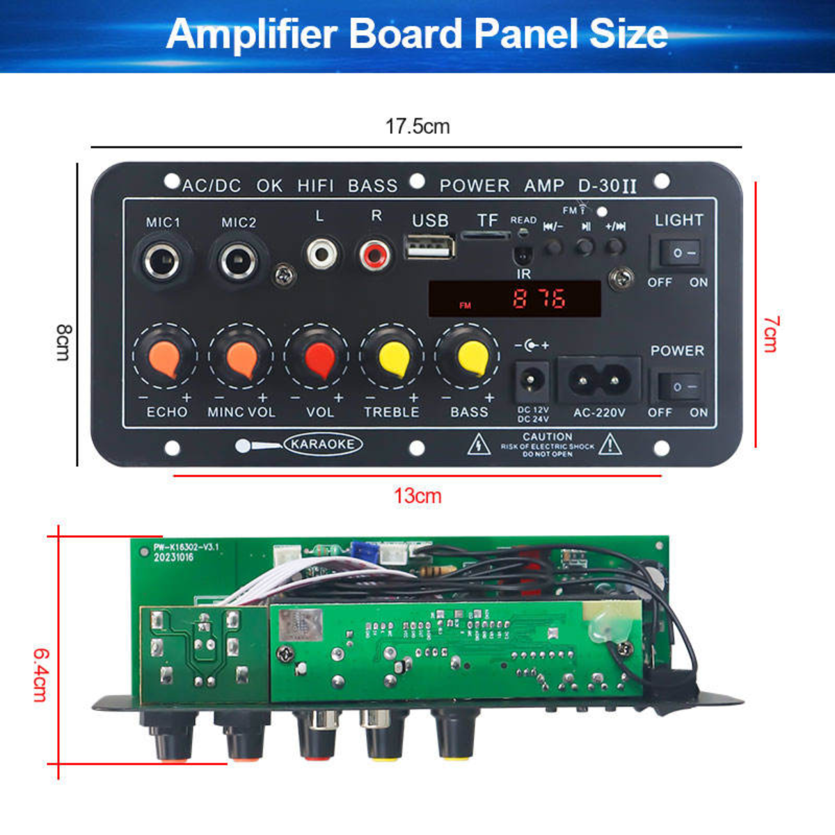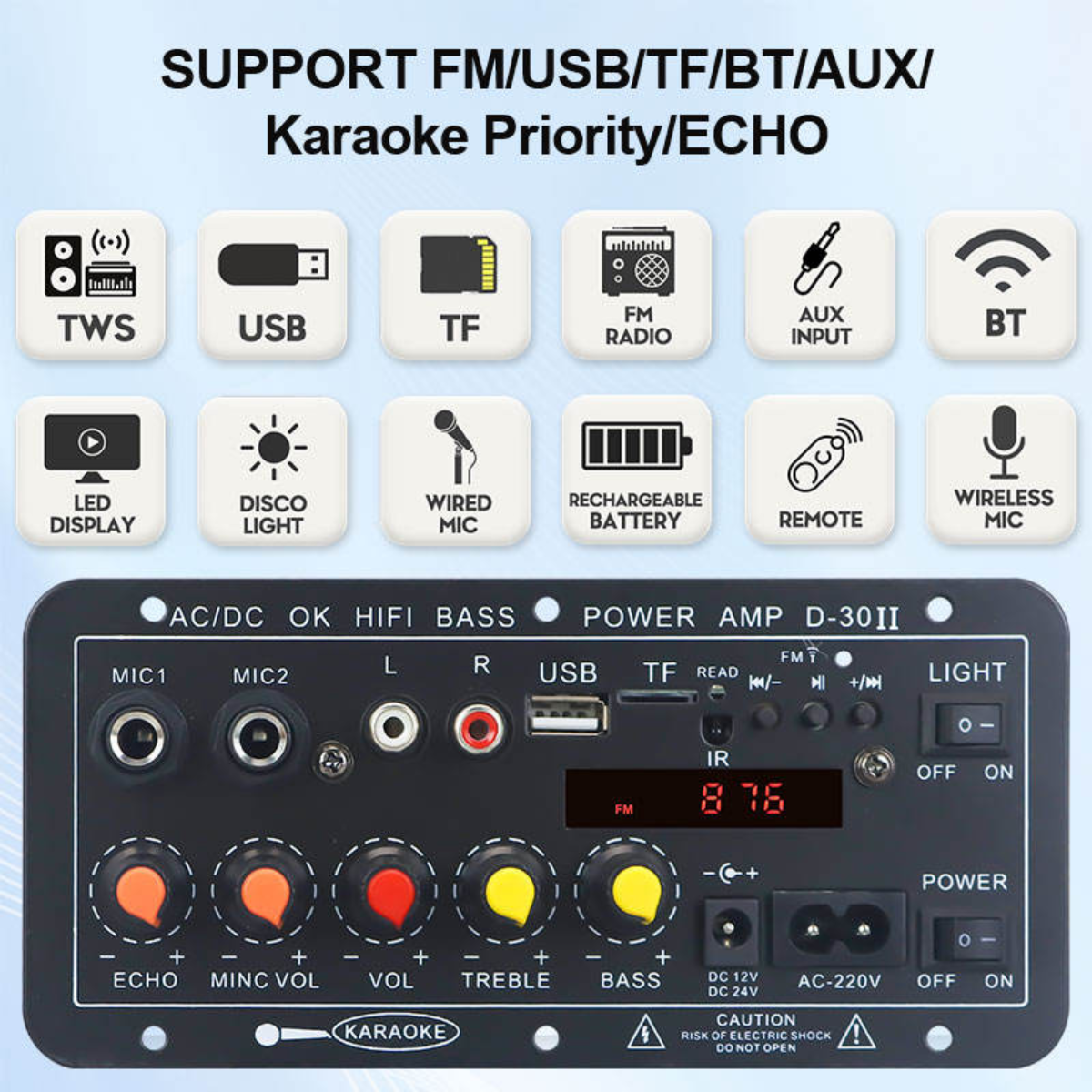 This VIRE mini amplifier is a versatile audio module with Bluetooth 5.0, FM radio, AUX input, dual microphone support, and independent treble bass master volume controls, making it ideal for outdoor and indoor use. It supports multiple voltage inputs (AC 110V 220V, DC 12V 24V) and reads MP3 files from TF cards and USB drives. Certified by FCC, ensuring compliance with international safety standards and providing market access assurance.