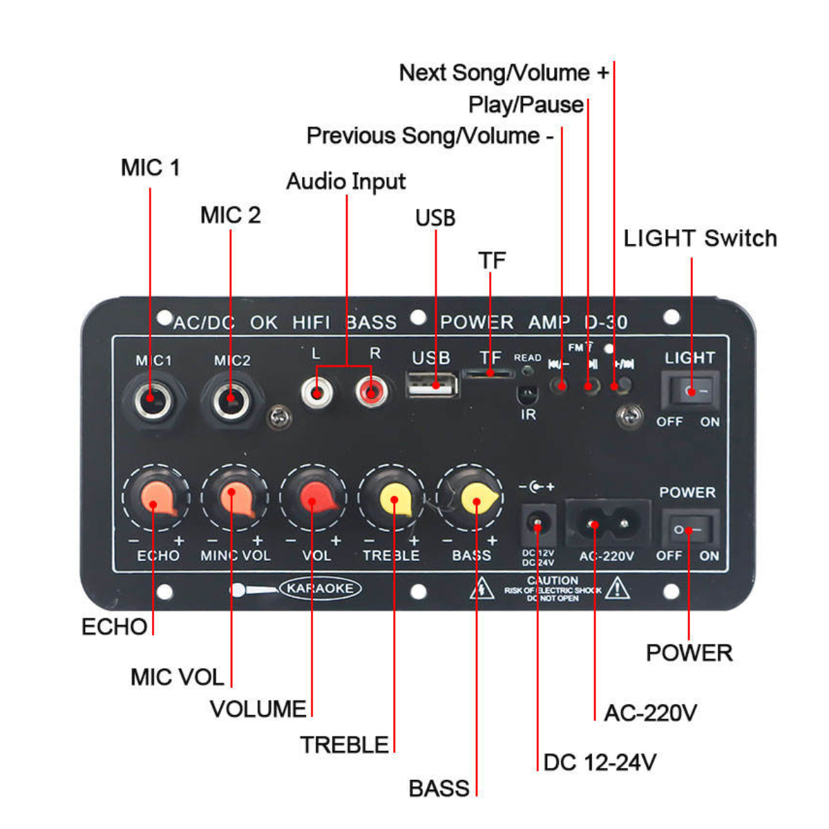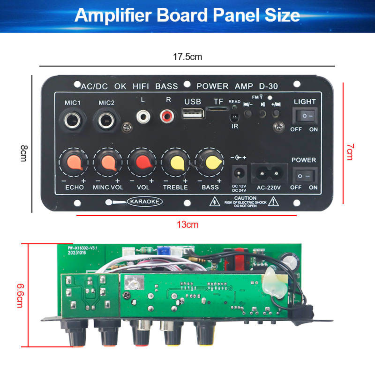 The VIRE Mini Amplifier Board supports versatile connectivity with Bluetooth 5.0, USB, SD card, AUX, and dual microphone inputs, offering independent treble, bass, and volume adjustments. It ensures wide voltage compatibility (AC 110V-220V, DC 12V-24V) and features a robust design with a 90dB signal-to-noise ratio and 0.03% distortion. Certified by FCC, it guarantees compliance with international safety standards, ensuring market access and reliability for global buyers.