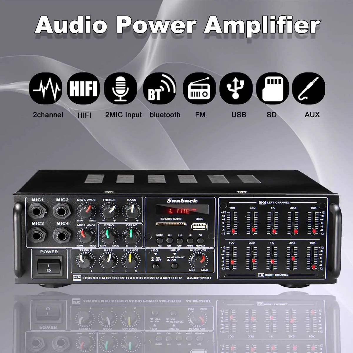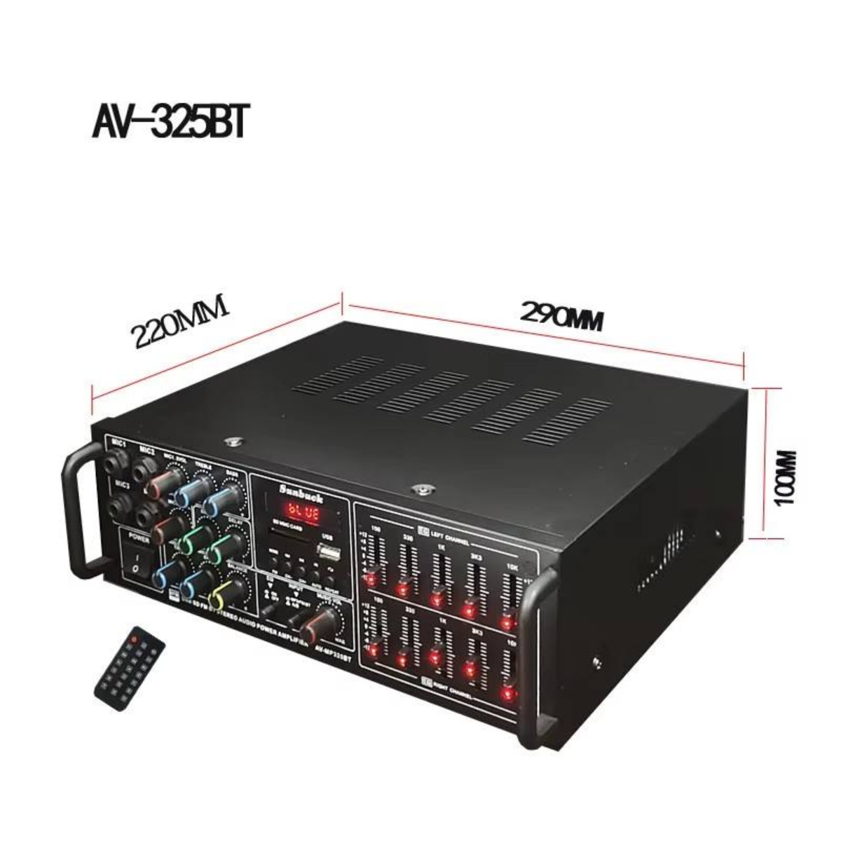 Feature highlights: The VIRE 325BT is a high-performance home amplifier with 200W*2 output power, featuring USB/SD/FM/AUX/Bluetooth connectivity, independent control equalizer, and 4-way microphone support. Its compact size of 29*24*10cm and durable metal construction ensure portability and longevity. Equipped with advanced DIP and SMT manufacturing, it guarantees superior quality and precision. FCC certification ensures compliance with international safety standards, offering buyers reliable market access.
