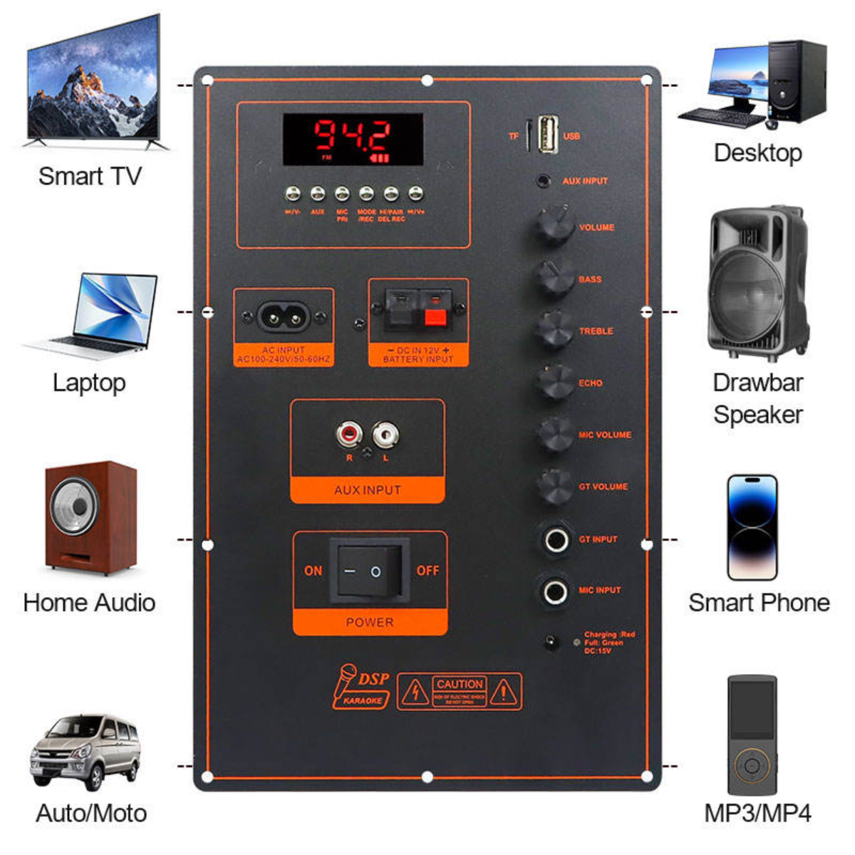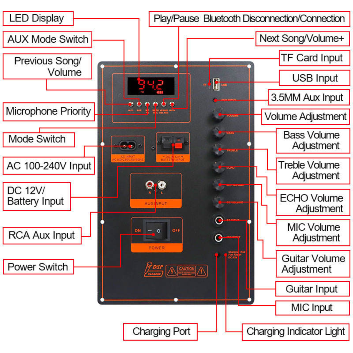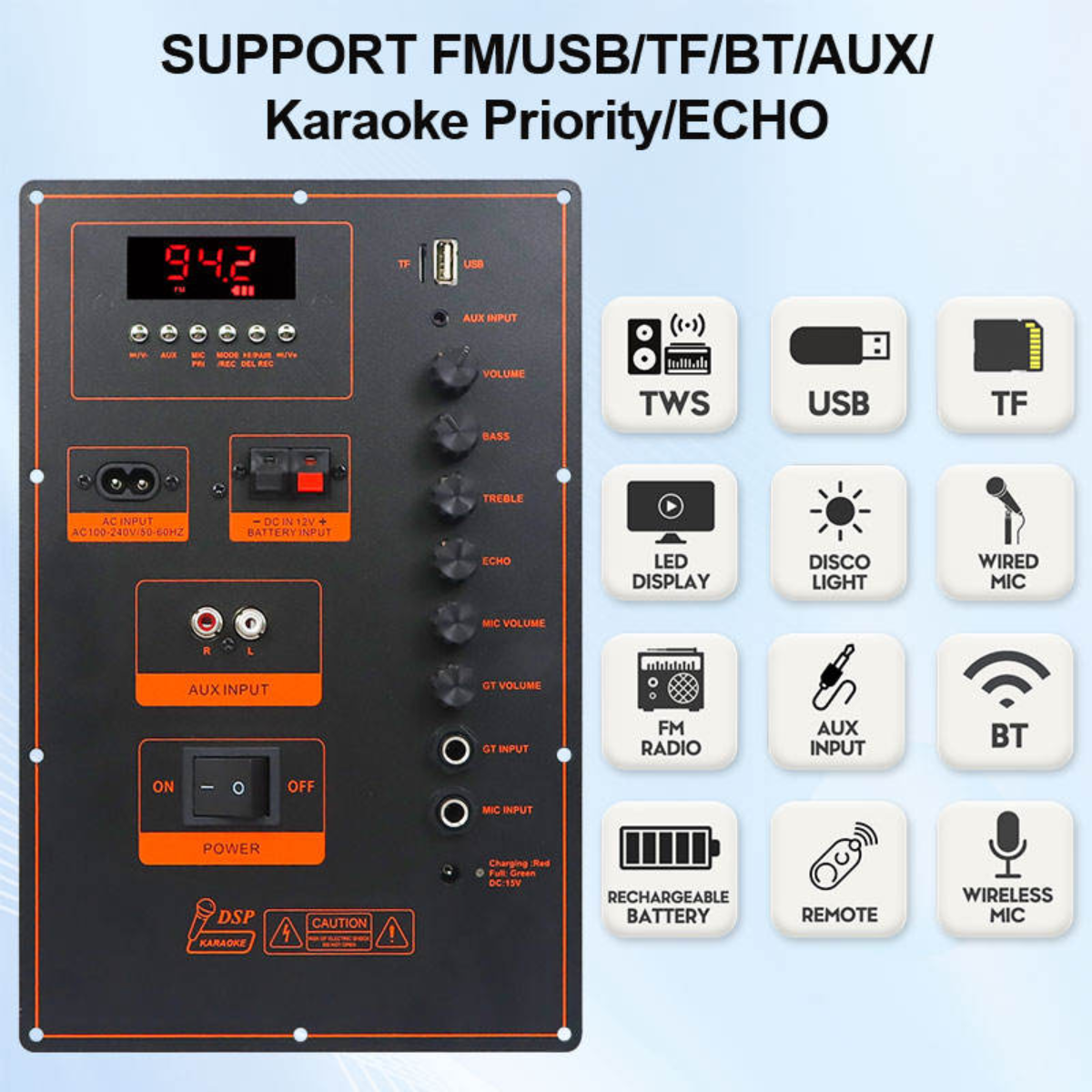 | Function | USB / TF / FM / AUX / BT / Karaoke / Guitar | RMS Output | 1 × 160W or 2 × 80W |