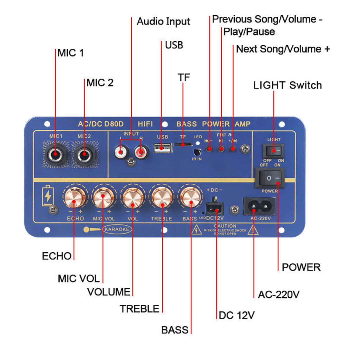 The VIRE Bluetooth Power Amplifier supports versatile voltage inputs (AC 110V 220V, DC 12V 24V) and features dual microphone inputs with adjustable reverb, independent treble, bass, and master volume controls. It includes advanced functions like Bluetooth 5.0, FM radio, AUX input, and USB TF-card support. Certified by FCC, ensuring compliance with international safety standards and providing market access for global buyers.