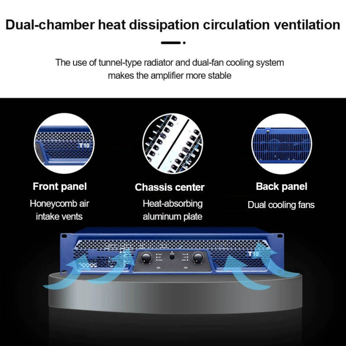 The VIRE Class H Professional Stage Performance Amplifier delivers robust power with 1200W*2 @8Ω, ultra-low distortion (<0.05% THD), and a wide frequency response (20Hz-20KHz). It features advanced heat dissipation, 2Ω stereo load capability, and bridge load 4Ω support, making it ideal for large venues like nightclubs and outdoor performances. Equipped with FCC certification, it ensures compliance with international safety standards, enhancing market access for professional audio setups.