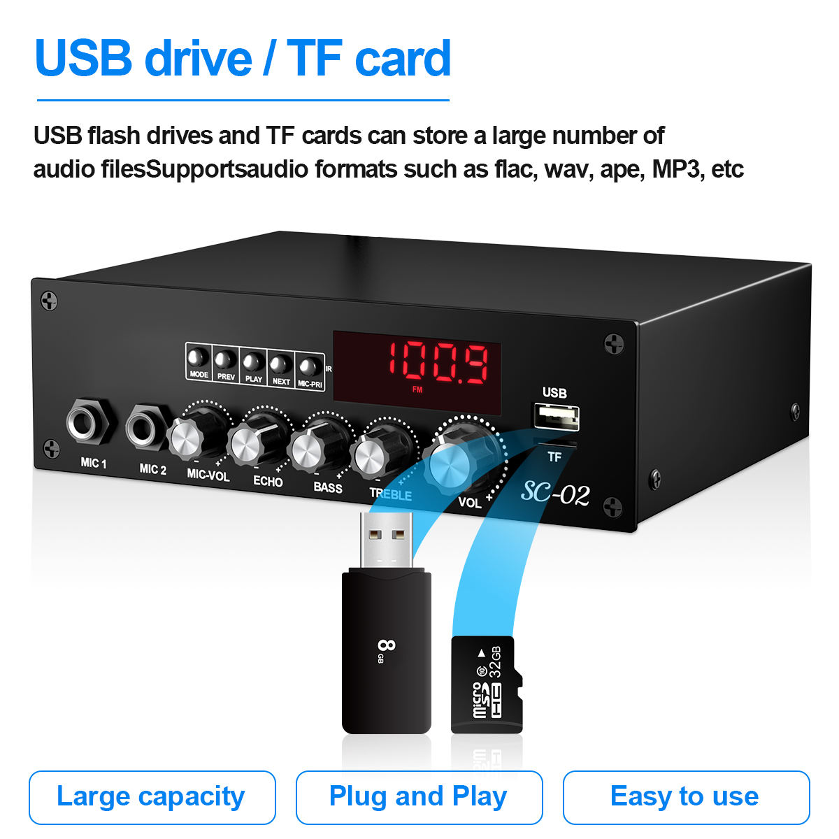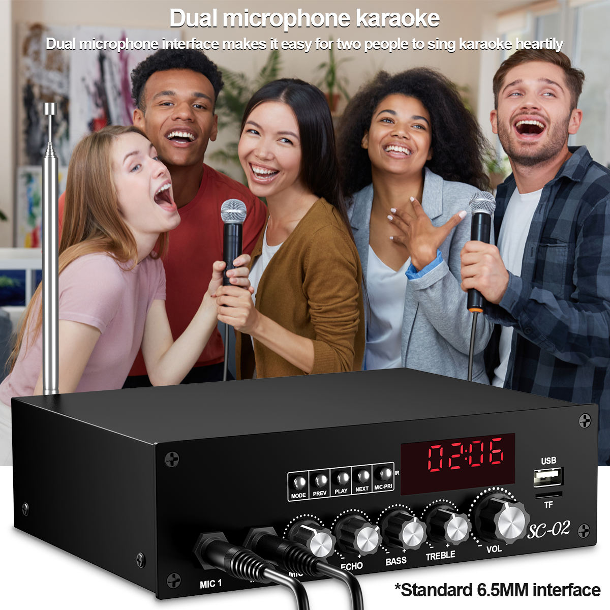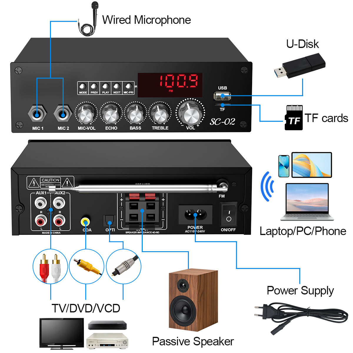 Feature highlights: The VIRE HIFI Decoder Audio Interface is a high-performance home amplifier with 2.0 channels, delivering 100W*2@4Ω RMS power and supporting versatile functions like BT/USB/TF/FM/AUX. Equipped with advanced Bluetooth V5.3 technology, it ensures stable connectivity within a 10-meter range. The product features an exceptional S/N ratio of ≥92dB and THD ≤0.1%, ensuring superior audio clarity. It supports dual voltage input (AC110-240V) for global use. Certified by FCC, it guarantees compliance with international safety standards, enhancing buyer confidence in quality and market access.