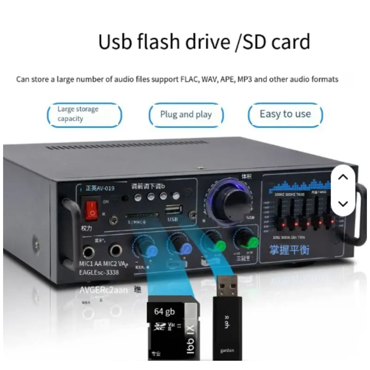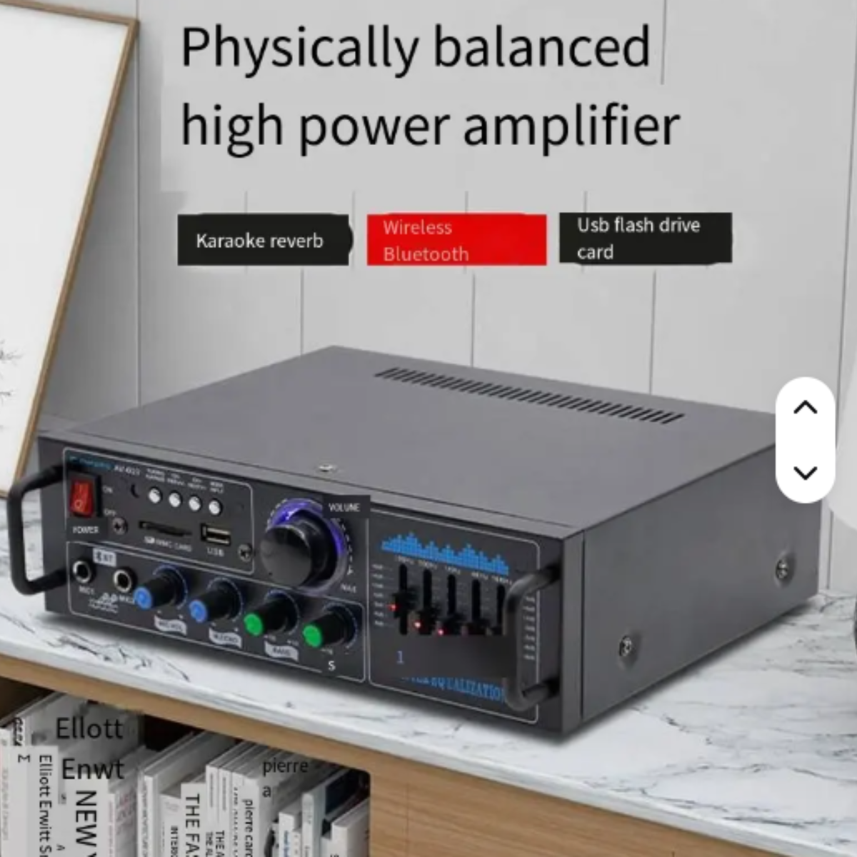 Equipped with multi-functional inputs, this amplifier supports USB, TF card, FM radio, AUX, and Bluetooth connectivity, ensuring seamless compatibility with various devices and music sources. The built-in Reverb, Karaoke, Bass, and Treble adjustments allow users to fine-tune their sound experience, while the EQ adjustment and IR remote control provide added convenience and customization.