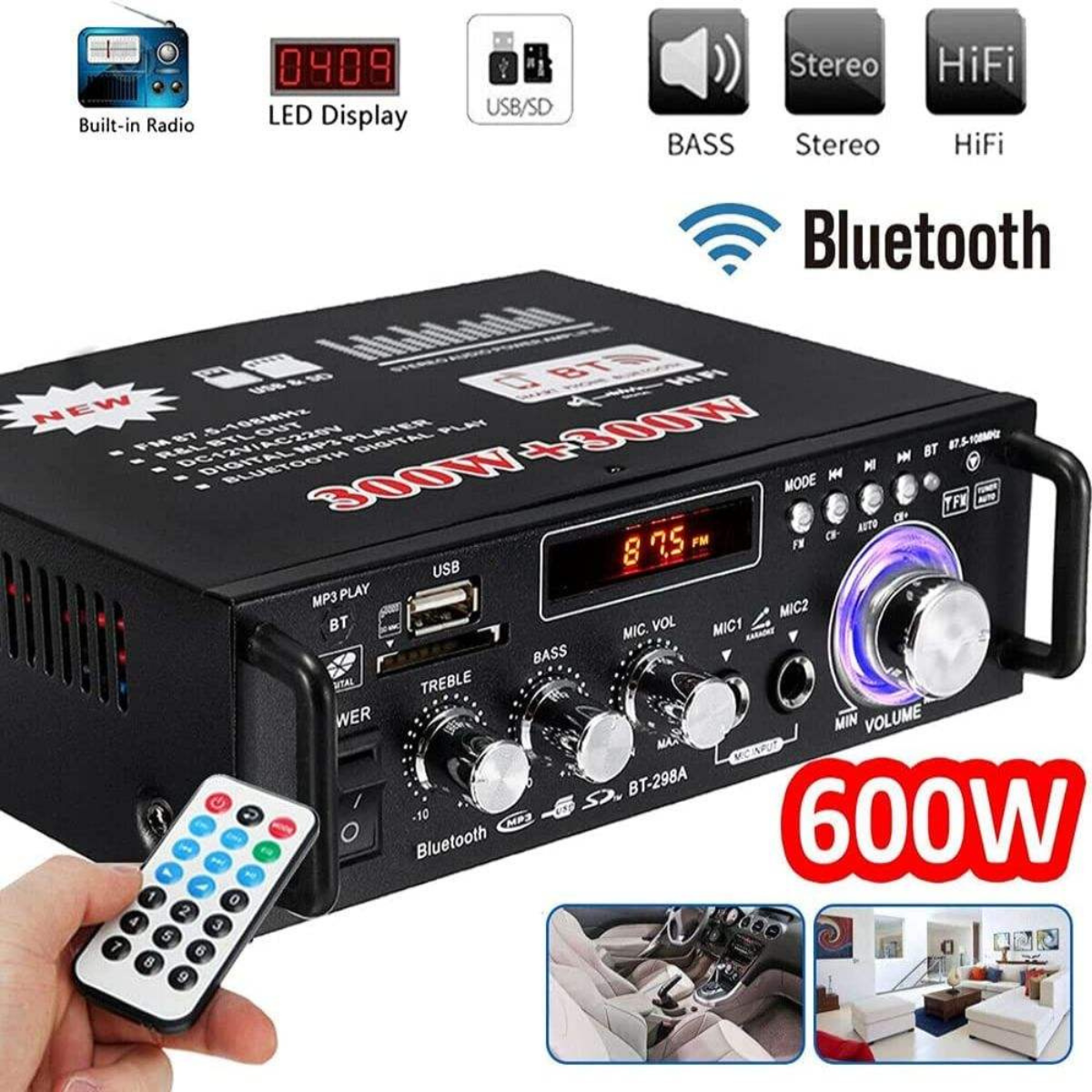 Built with a durable metal body, the AV-298 combines strength with a sleek, compact design measuring just 18 × 14 × 5.5 cm, making it space-saving yet highly efficient. Supporting multiple input formats including MP3, FM radio, Bluetooth, AUX, USB, and SD card, this amplifier offers seamless connectivity for different devices, whether for music playback, home theater, or karaoke.