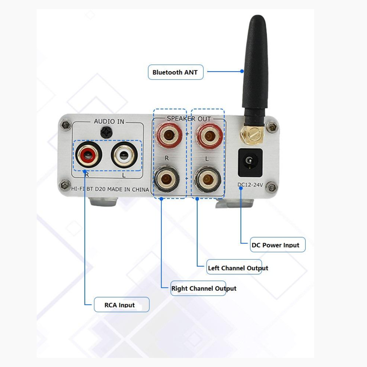 This VIRE Stereo Audio Amplifier delivers 2x100W output power, featuring Bluetooth 5.0 with a 39ft wireless range, TI TPA3255 chip for clear, noise-free sound, and advanced speaker protection circuitry. Its compact aluminum design ensures high quality and durability, making it ideal for home or office use. The product supports MP3, WMA, WAV, and FLAC formats, with bass and treble control for Hi-Fi sound. It includes a 24-month warranty and FCC certification, ensuring compliance with international safety standards and enhancing market access.